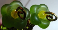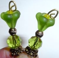 Lime Tulips This pair is made up of a lime green matte tulip top beads which hold small yellow Czech glass beads. Matching crystal beads rest at base. Antiqued gold accents complete the design. Price: $24.00 on straight sticks, see pricing guide when topper is put on Ketylo sticks.