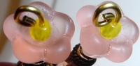 Peach Tulips This pair is made up of a peach matte tulip top beads which hold small yellow Czech glass beads. Peach Czech glass beads rest at base. Antiqued gold accents complete the design. Price: $24.00 on straight sticks, see pricing guide when topper is put on Ketylo sticks.