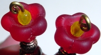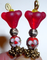 Strawberry Blossom Tulips This pair is made up of a red matte tulip top beads which hold small yellow Czech glass beads. Red based Cloisonné beads rest at base. Antiqued gold accents complete the design. Price: $24.00 on straight sticks, see pricing guide when topper is put on Ketylo sticks.
