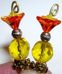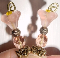 Sunshine Tulips This pair is made up of a transparent, fire opal tulip top beads which hold small sized, yellow Czech glass beads. Yellow Czech glass beads rest at base. Antiqued gold accents complete the design. Price: $24.00 on straight sticks, see pricing guide when topper is put on Ketylo sticks.