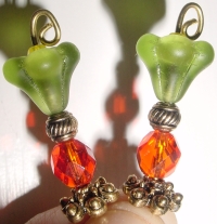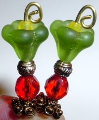 Tropical Tulips This pair is made up of a lime green matte tulip top beads which hold small yellow Czech glass beads. Hyacinth Czech glass beads rest at base. It is hard to capture the color properly on these, but it's a deep orange. Antiqued gold accents complete the design. Price: $24.00 on straight sticks, see pricing guide when topper is put on Ketylo stick.