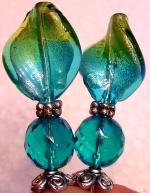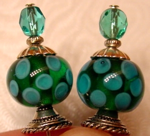 Key Lime This pair is made up of light teal Czech glass top beads and lampwork bottom beads with lime green background and teal spots. Antiqued silver finding complete the design. Price: $23.00 on straight sticks, see pricing guide when topper is put on Ketylo sticks