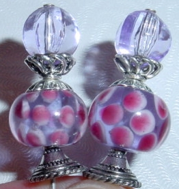 Lil' Bits of Lavender This pair created of lavender vintage acrylic top beads and lampwork bottom beads in lavender with pink and white rimmed dots. Antiqued silver finding complete the design. Price: $23.00 on straight sticks, see pricing guide when topper is put on Ketylo sticks