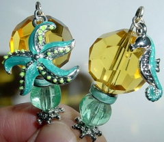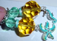 Sun and Sea Large size arrangement!! This pair is made up of large sized Czech glass beads golden topaz. They sit above enameled spacers that coordinate with the vintage acrylic bottom beads in light teal. Our friends from the sea dangles, Starfish and Seahorse, dangle from top. These are also enameled. Perfect for your trip to the beach! Silver accents complete the design. Price: $25.00 on straight sticks, see pricing guide when topper is put on Ketylo stick.