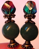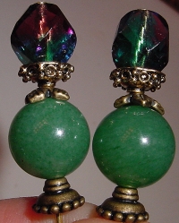 Somewhere Over the Rainbow One pair only! Gorgeous tricolor (blue, purple, green) beads in a hexagonal cut sit above a Jade type round bead. I am not sure exactly what this bead is, but it's beautiful. Antiqued brass findings, including a leaf styled spacer, complete the pair. Price per pair: $24.00 on straight sticks, see pricing guide when topper is put on Ketylo sticks.
