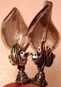 Galadriel's Gift These sticks are made up of gorgeous silver foil, twisting Venetian beads in smoky silver. Many other colors are available though! At the base rests what we call the Elven's cloak brooch clasp. Renaissance styled pewter accents complete the pair. A very unique "Lord of the Rings" design! Price per pair: $35.00 on straight sticks, $45.00 when topper is put on Ketylo sticks.