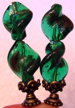 Emerald Spear Small twisting leaf beads in Emerald with glimmery, golden accents create this spiral spear. This is a longer arrangement for those of you who enjoy more decorative topper length. You may also request one bead only on each stick top instead of two. Antiqued brass accents complete this pair! Price per pair: $25.00 on straight sticks, see pricing guide when topper is put on Ketylo sticks.