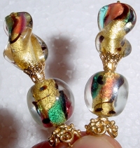14kt. Sterling These sticks are made up of gorgeous gold and silver foil, twisting Venetian beads in gold with silver stripes. Czech glass faceted beads at bottom are in silver (mirror-like reflection) Silver and gold accents complete this amazing pair! Price per pair: $30.00 on straight sticks, $42.00 when topper is put on Ketylo sticks.