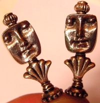 Alice in Wonderland (shown here in silver, also available in gold) Die cast facial beads are the focal point of this design. Face is shown both front and back. Silver (or gold) accents complete the pair. Price per pair: $23.00 on straight sticks, see pricing guide when topper is put on Ketylo sticks.