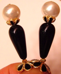 Classic Lady This pair is a combined design effort of myself and my 14 year old niece! she think they are "classy!" So we are calling them Classic Lady! Czech glass large teardrops sit beneath faux pearls. 14kt gold plated bead accent rests at bottom while Cloisonné bead caps in black and gold complete the design. Price per pair: $21.00 on straight sticks, see pricing guide when topper is put on Ketylo sticks.