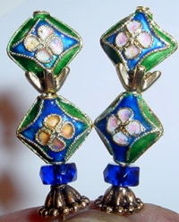 Topiary Cloisonné beads combine with a rich blue Czech glass rondelle! Gold accents complete the pair. Price per pair: $22.00 on straight sticks, see pricing guide when topper is put on Ketylo sticks.