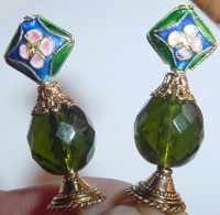 Olive Garden Cloisonné beads combine with a rich blue Czech glass rondelle! Gold accents complete the pair. Price per pair: $23.00 on straight sticks, see pricing guide when topper is put on Ketylo sticks.