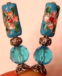 Pacific Lily Cloisonné beads combine with pool water blue Celestial Crystal beads! Silver accents complete the pair. Price per pair: $23.00 on straight sticks, see pricing guide when topper is put on Ketylo sticks.