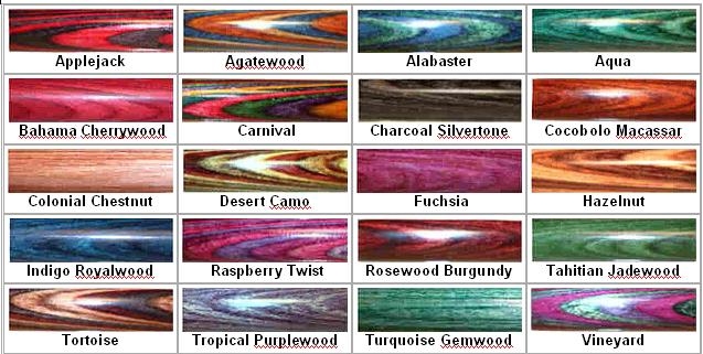 From left to right shown in all three sizes: Cocobolo, Lacewood (now discontinued), Gonalco Alves, Purpleheart, Moradillo, Bocote, Walnut, Cardinal, Kingwood, Canarywood, East Indies Rosewood, and Honduran Rosewood. Also available: Gabon and Macassar Ebony woods, Tulipwood, and Pink Ivory.