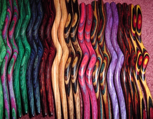 Ketylo Corkscrew Spiral Sticks in Exotic hardwoods and Dymondwood colors- available plain in lengths of 5 inches for $13.00 per single, 6 inches for $14.00 per single, and 7 inches long for $16.00 per single. Also available "crowned" for $38.00, $42.00, $46.00 per pair (half that for singles). More details on stick pages! This is the only place to get Customized Crowned Ketylos!! You pick the wood, you pick the length, you pick the topper!! Custom lengths available on topped sticks. A note about Dymondwood colors. These are considered waterproof and can go in soaking wet hair! A great option if you are having to put your hair while it's still wet or damp! We do have some additional colors not shown here, like Ironwood, Sunny Skies, and Tropical Passionwood - a beautiful bright pink! Please ask about colors you might be interested in, but are not shown here.